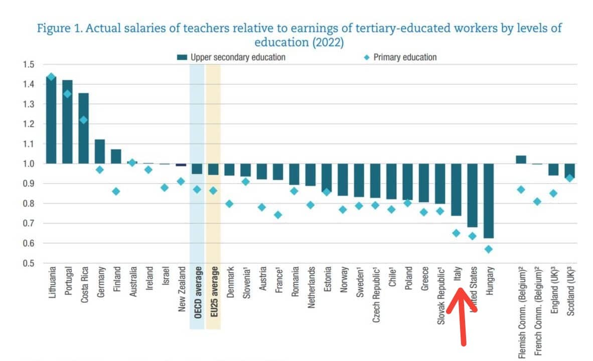 Now, I don't think I need to tell you that Italy lags behind many other OECD countries in terms of teacher salaries, but what I find more interesting is the comparison of teacher salaries with the salaries of the general population with a university degree.