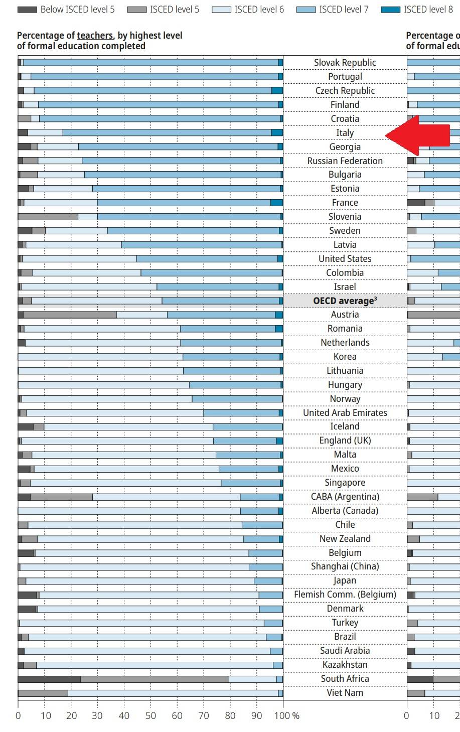 Italian teachers are, on the whole, extremely well-educated: they have master's degrees (this is called ISCED level 7 in OECD speak) and even doctorates (ISCED level 8) far more often than the OECD average 👇
