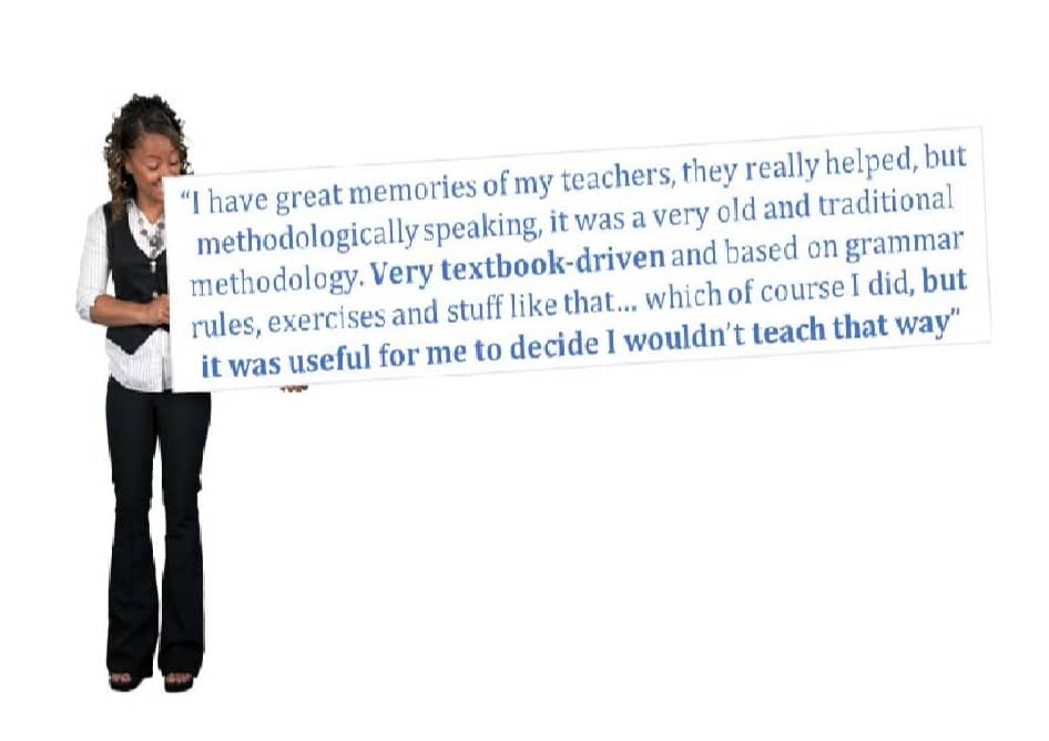 So, as much as you would like to teach exclusively in the L2, never explain a grammar rule deductively and do a lot of fun-filled, joyous, group activities, you may very well find yourself doing the exact opposite and replicating what your teachers did.