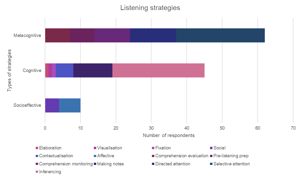 Now, although this doesn't reflect learners at large, it is encouraging to see that so many learners used metacognitive strategies, which by this point I probably don't need to tell you are the crème de la crème of strategies. What you might notice, however, is that socio-affective strategies weren't used quite as much by these students, which begs the question: why on earth not?