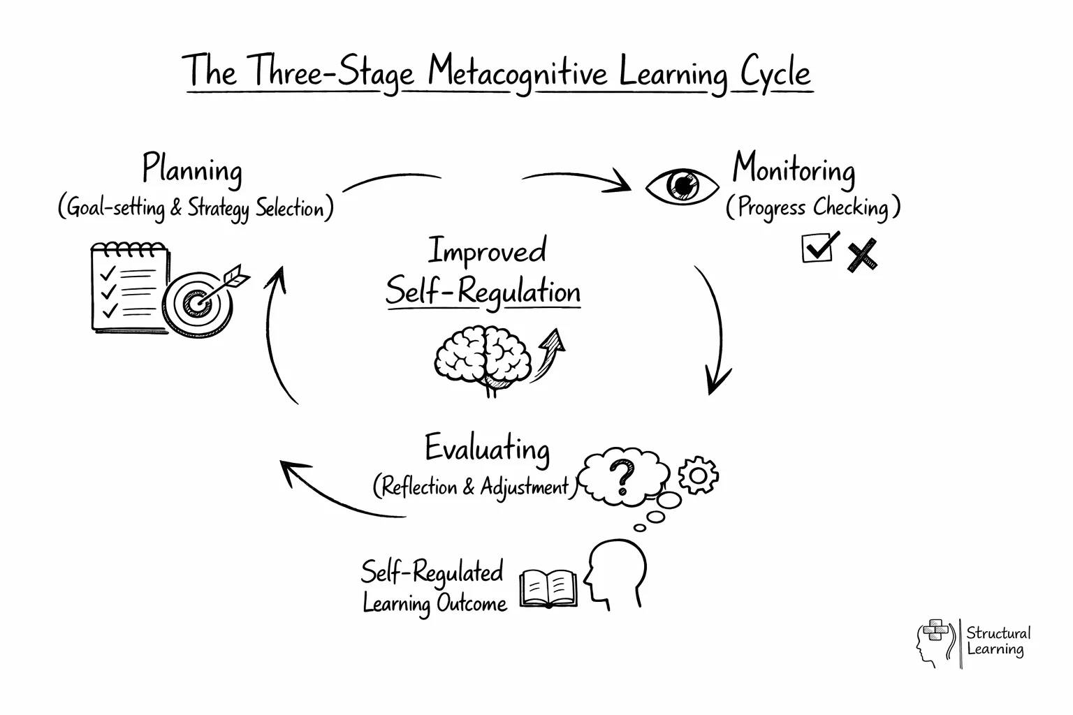 You can think of metacognition like a 3-stage cycle: planning, monitoring and evaluating.