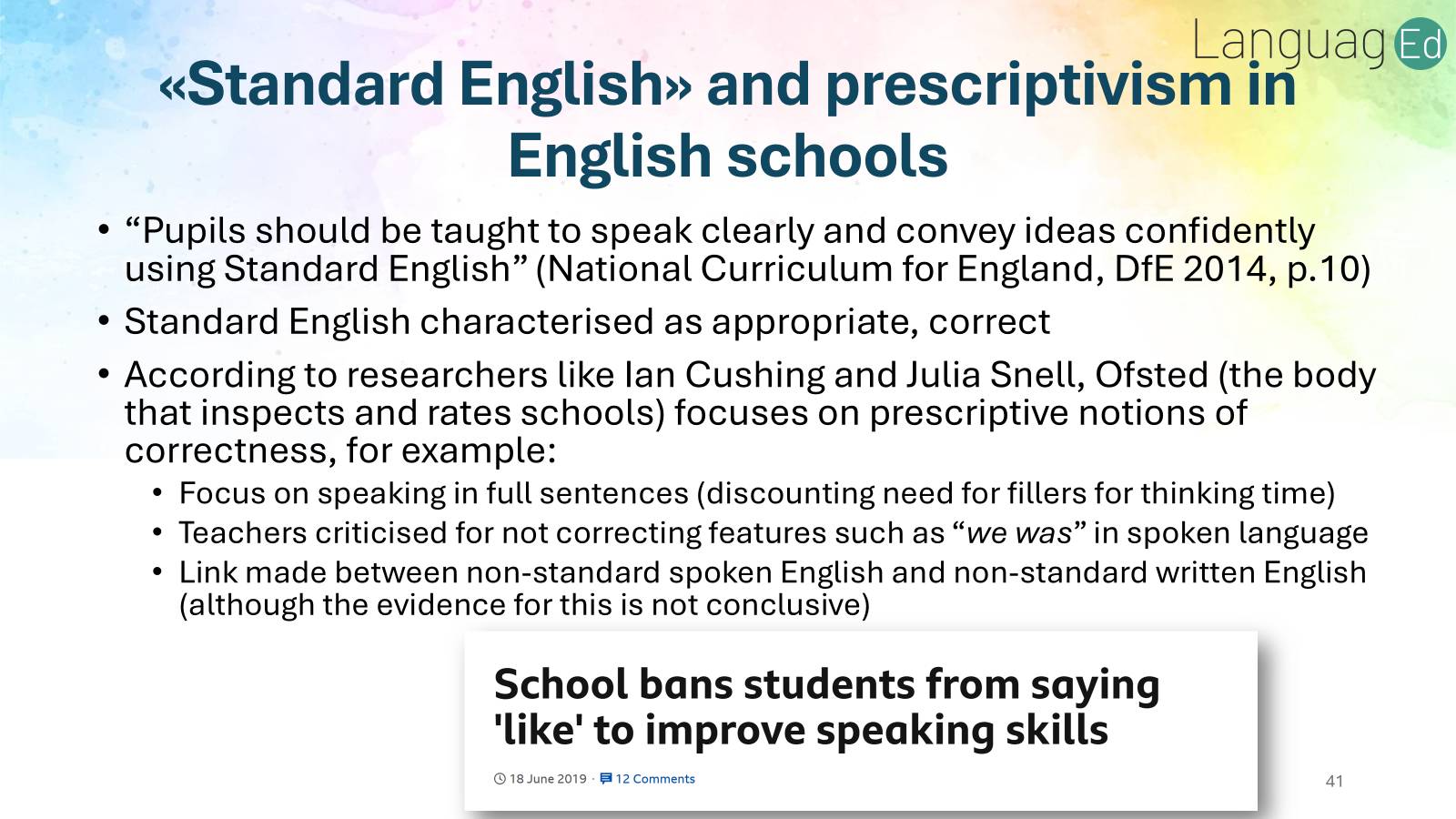 For example, Ofsted, the body that inspects school in England, takes this policy and applies it with some rather inflexible notions of what standard English is, as I explained in the Culture in English-language speaking course: