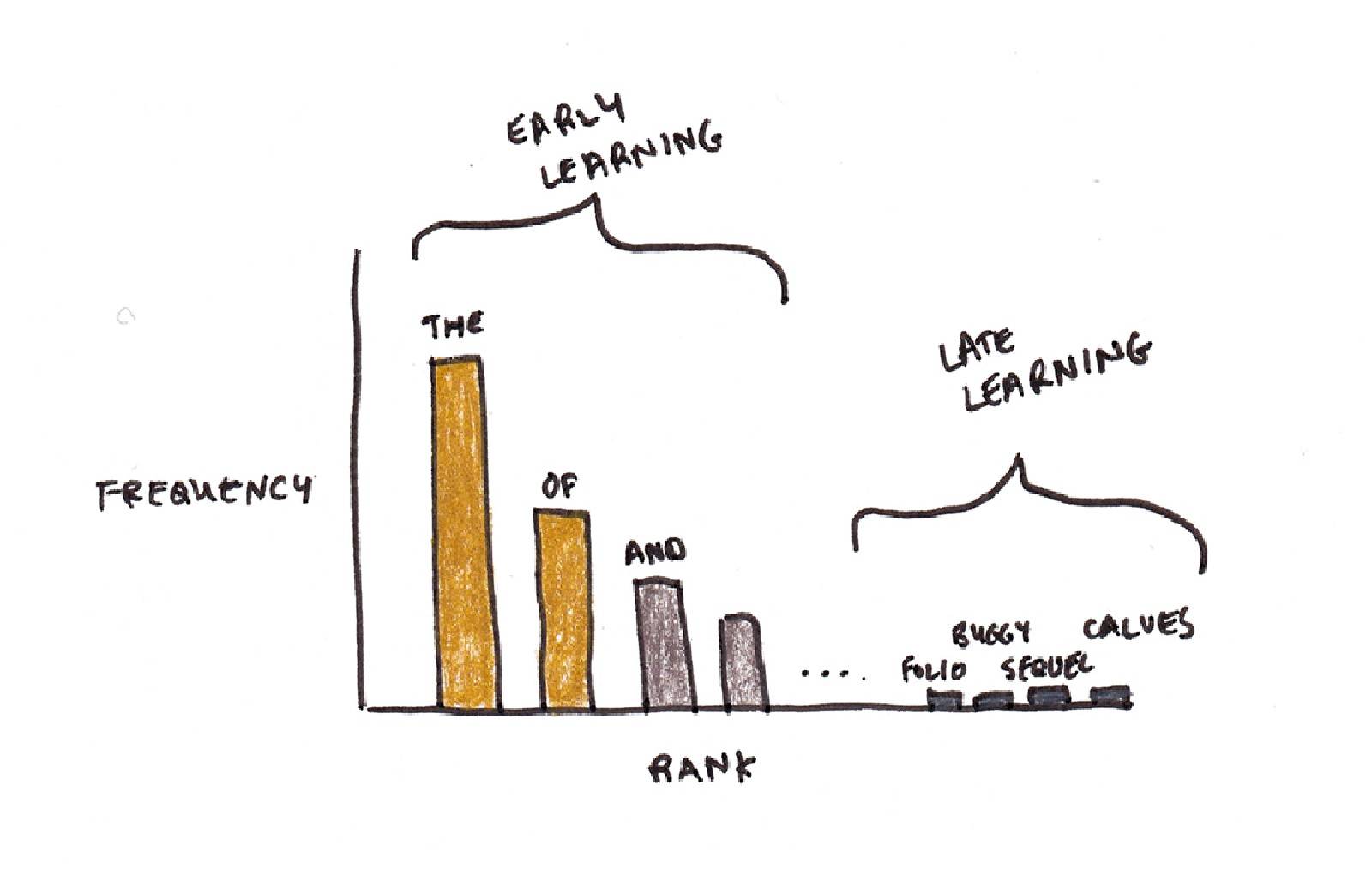 In this fascinating post exploring the plateau stage, Scott Young explains one of the ways in which the plateau manifests itself when it comes to learning vocabulary. When you start off, you're likely to learn words that occur very frequently in language, like "the", "do" or "of". So the effort you put in offers a great return on investment, because you'll see and hear those words often.